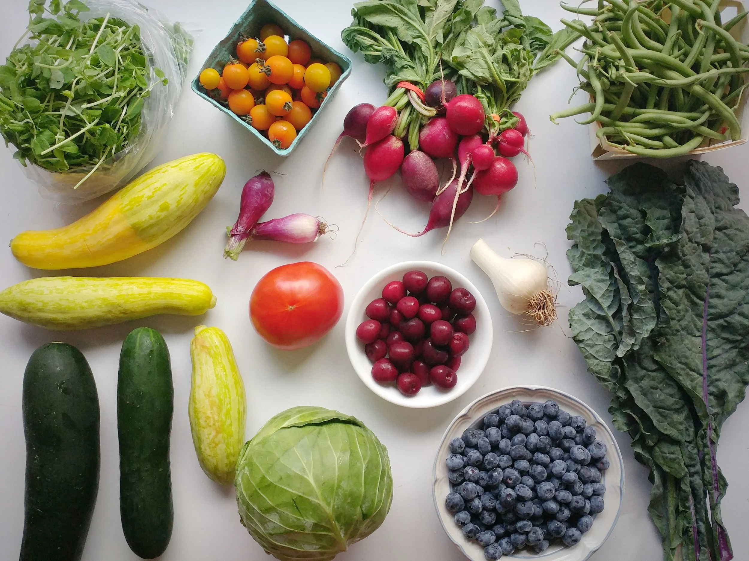 Pea Shoots, Sungold Tomatoes, Radishes, Green Beans, Dino Kale, Garlic, Blueberries, Sweet Cherries, Tomatoes, Cabbage, Summer Squash, Zucchini, Cucumber.