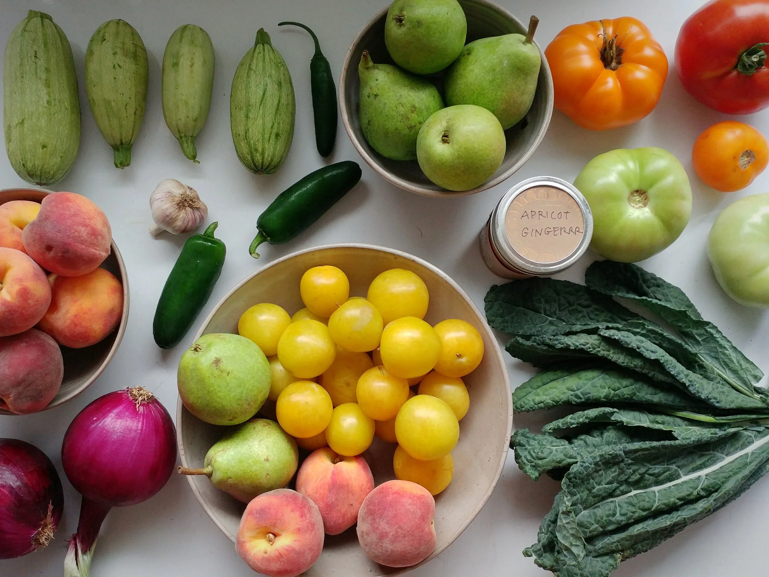 Cuesa Squash, Serrano Pepper, Jalopeno Pepper, Garlic, Peaches, Red Onion, Pears, Plums, Dino Kale, Apricot Ginger Jam, Green Tomatoes, Tomatoes